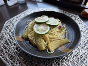 それと、なんとなくオシャレそうなので「カボス香る若鶏とナスの和風パスタ」なるものをいただきました٩(ˊᗜˋ*)و