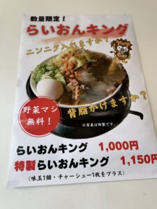 メニューは豚骨ラーメンに中華そば、豚骨カレー、まぜそばなどがあり、「らいおんキング」なるほぼ二郎系のもやお弁当も格安です!