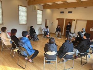 集会室で温泉入浴介助のレクチャーを行い、その後は男女に分かれて温泉体験へ