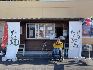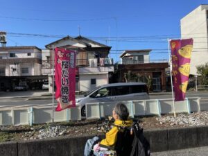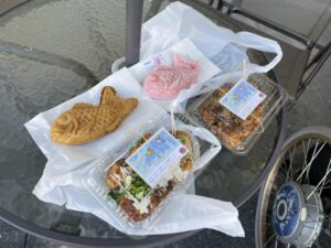 津久見産の地タコが入ったアツアツのたこ焼きと、ピンク色が可愛い桜たい焼きをゲットー