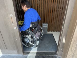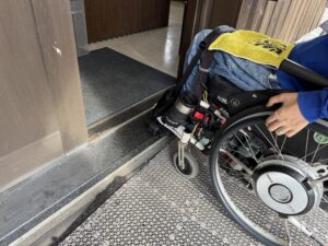 入口はちょっとガタガタっとなるくらいで介助を要する段差ではありません。