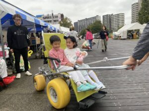 ホルトホール大分「いこいの広場」 第45回大分県障がい者・児 秋の交換会に参加しました! 砂浜を走れる車椅子「ジャリスター」などを体験していただき、 たくさんの笑顔が見られました
