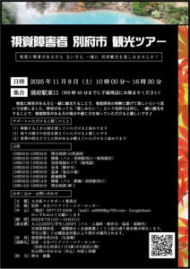 視覚障害者 別府市 観光ツアー 視覚に障害がある方も ない方も 一緒に 別府観光を楽しみませんか? 日時:2025年11月8日(土)10時00分~16時30分 集合:別府駅東口(※9時45分までに手湯周辺にお集まりくださ […]
