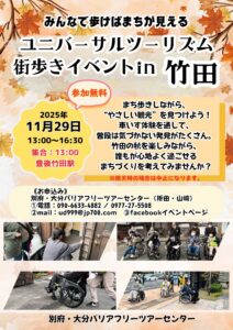 みなさん、こんにちは♪ 秋の竹田といえば、やさしい灯りがまちを包む「竹楽(ちくらく)」が有名ですよね。 そんな素敵な季節の竹田で、誰もが安心して楽しめる観光地づくりを目指した街歩きイベントを開催します! 今回は、 […]